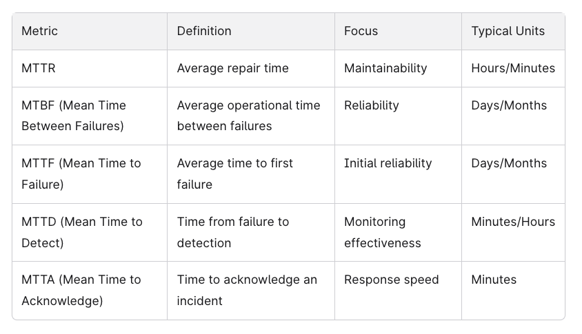 L'MTTR è uno dei diversi parametri essenziali per la manutenzione e l'affidabilità. Comprendere la sua relazione con gli altri parametri aiuta a fornire una visione completa dello stato di salute del sistema.