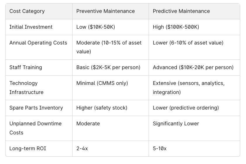 Comprendere le implicazioni finanziarie della manutenzione preventiva rispetto a quella predittiva è fondamentale per prendere decisioni informate sugli investimenti nella strategia di manutenzione. La struttura dei costi e i profili di ritorno sull'investimento differiscono in modo significativo tra questi due approcci.